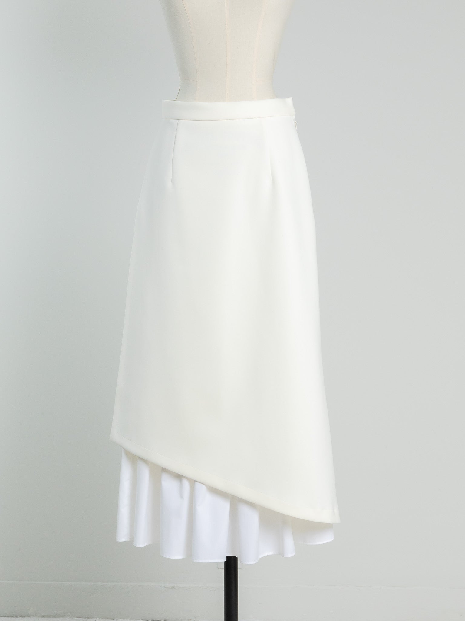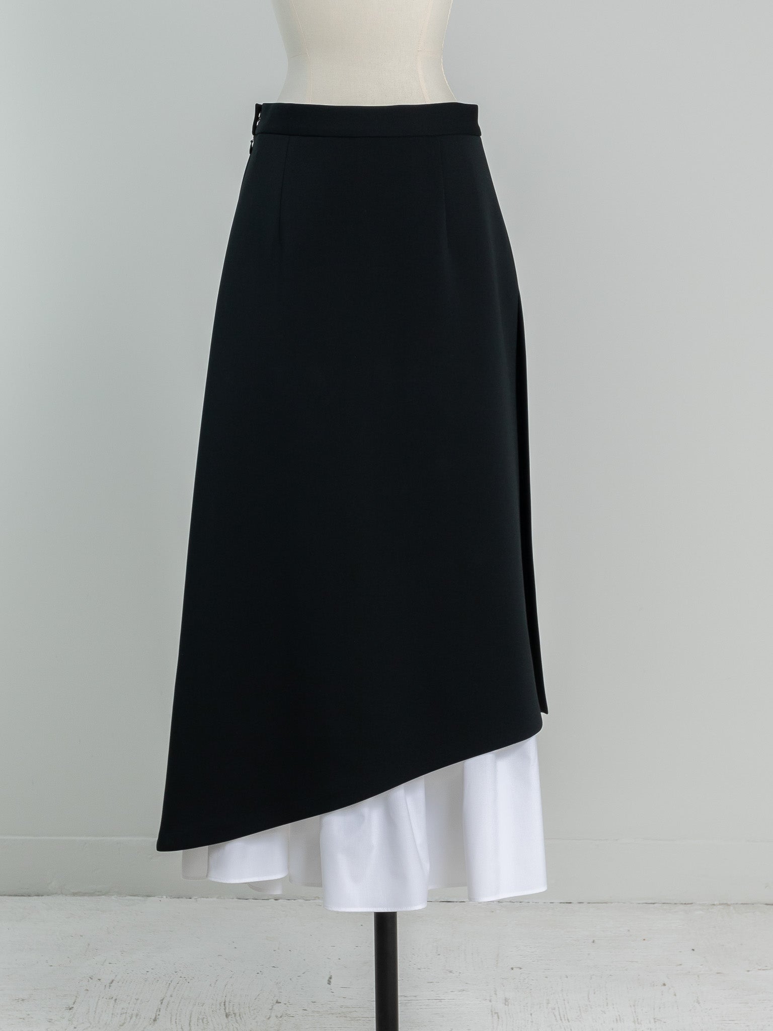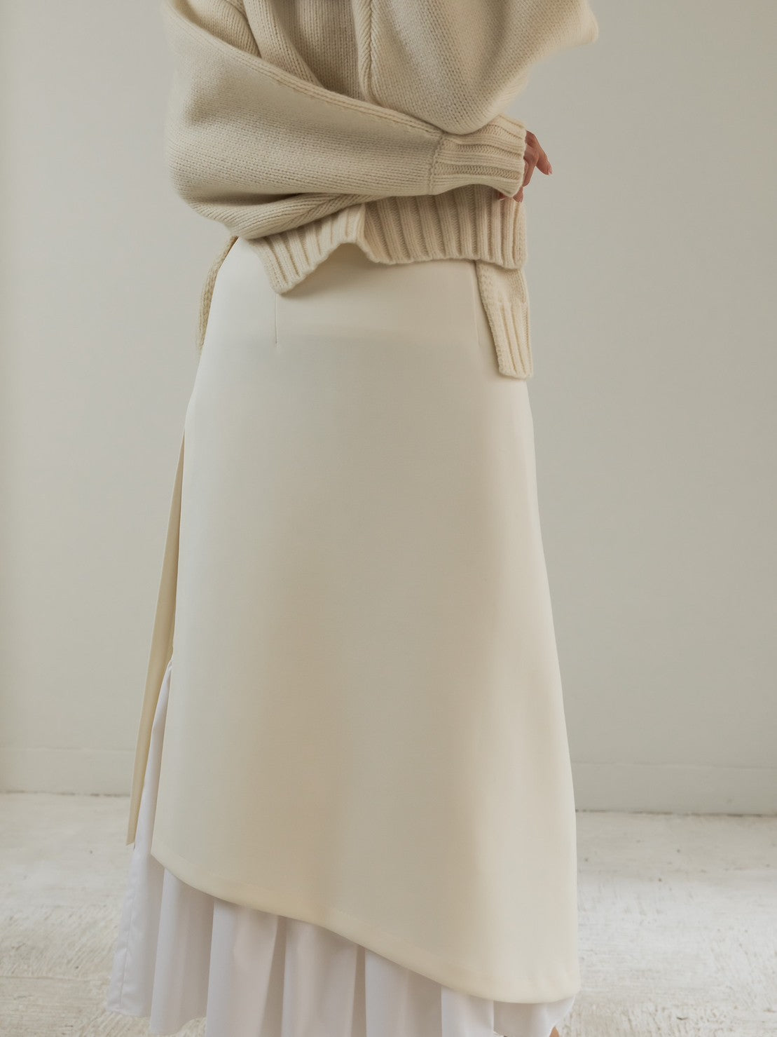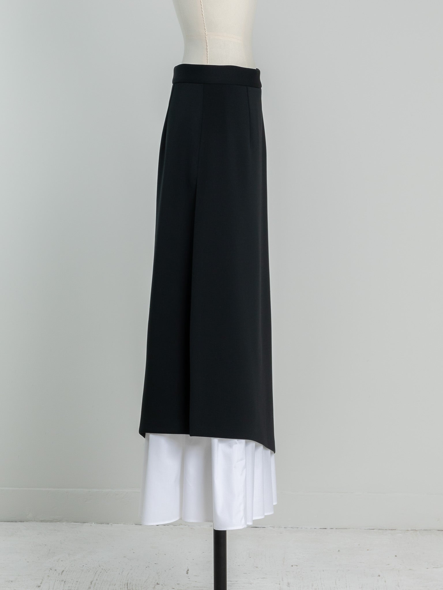 This skirt features an inner skirt that peeks out from under the outer skirt, creating an accent. The inner skirt is separate and removable, making it easy to care for and enjoyable for a variety of styling options. The inner skirt is of such high quality that it can be worn on its own if you wear a petticoat underneath. The skirt has tucks at the waist to fit nicely around the hips, and from there it forms a gentle A-line that flows down to the feet, barely highlighting the lines of your lower body, making it a great way to enhance your figure. The silhouette is not too flared, and the sweetness is kept to a minimum, making this a skirt that pants lovers should definitely try. You can change the impression by pairing it with a low or high gauge knit. It is made from a material that can be worn all year round, so come spring, you can pair it with your favorite shirt or blouse to create even more diverse looks. Enjoy the way the inner skirt naturally sways gently as you walk.