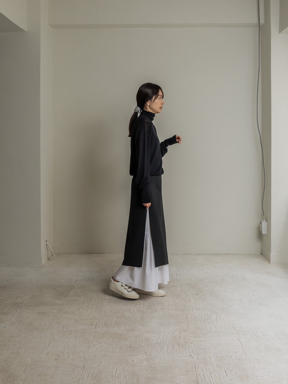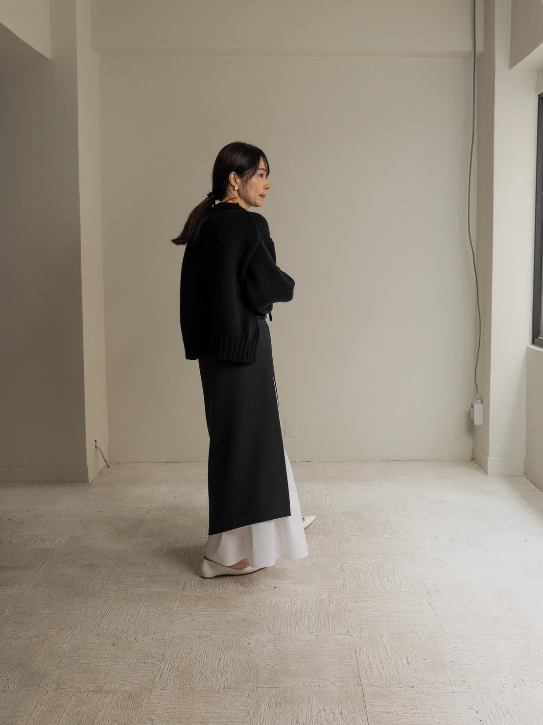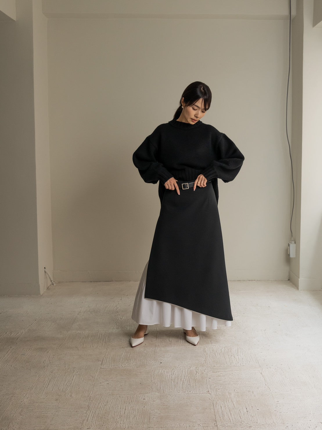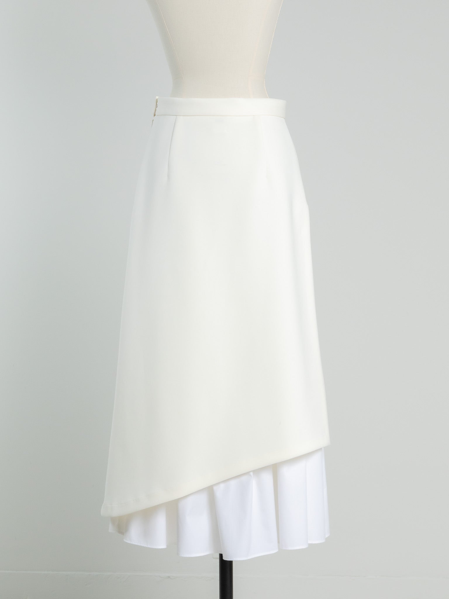 This skirt features an inner skirt that peeks out from under the outer skirt, creating an accent. The inner skirt is separate and removable, making it easy to care for and enjoyable for a variety of styling options. The inner skirt is of such high quality that it can be worn on its own if you wear a petticoat underneath. The skirt has tucks at the waist to fit nicely around the hips, and from there it forms a gentle A-line that flows down to the feet, barely highlighting the lines of your lower body, making it a great way to enhance your figure. The silhouette is not too flared, and the sweetness is kept to a minimum, making this a skirt that pants lovers should definitely try. You can change the impression by pairing it with a low or high gauge knit. It is made from a material that can be worn all year round, so come spring, you can pair it with your favorite shirt or blouse to create even more diverse looks. Enjoy the way the inner skirt naturally sways gently as you walk.