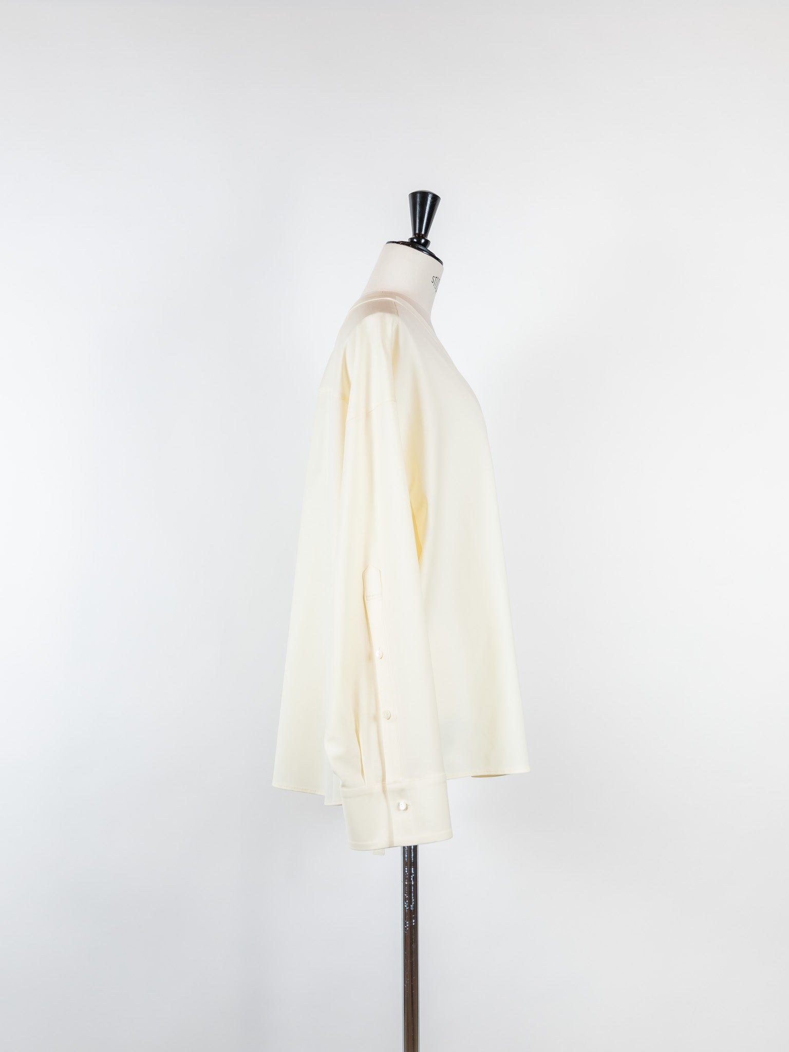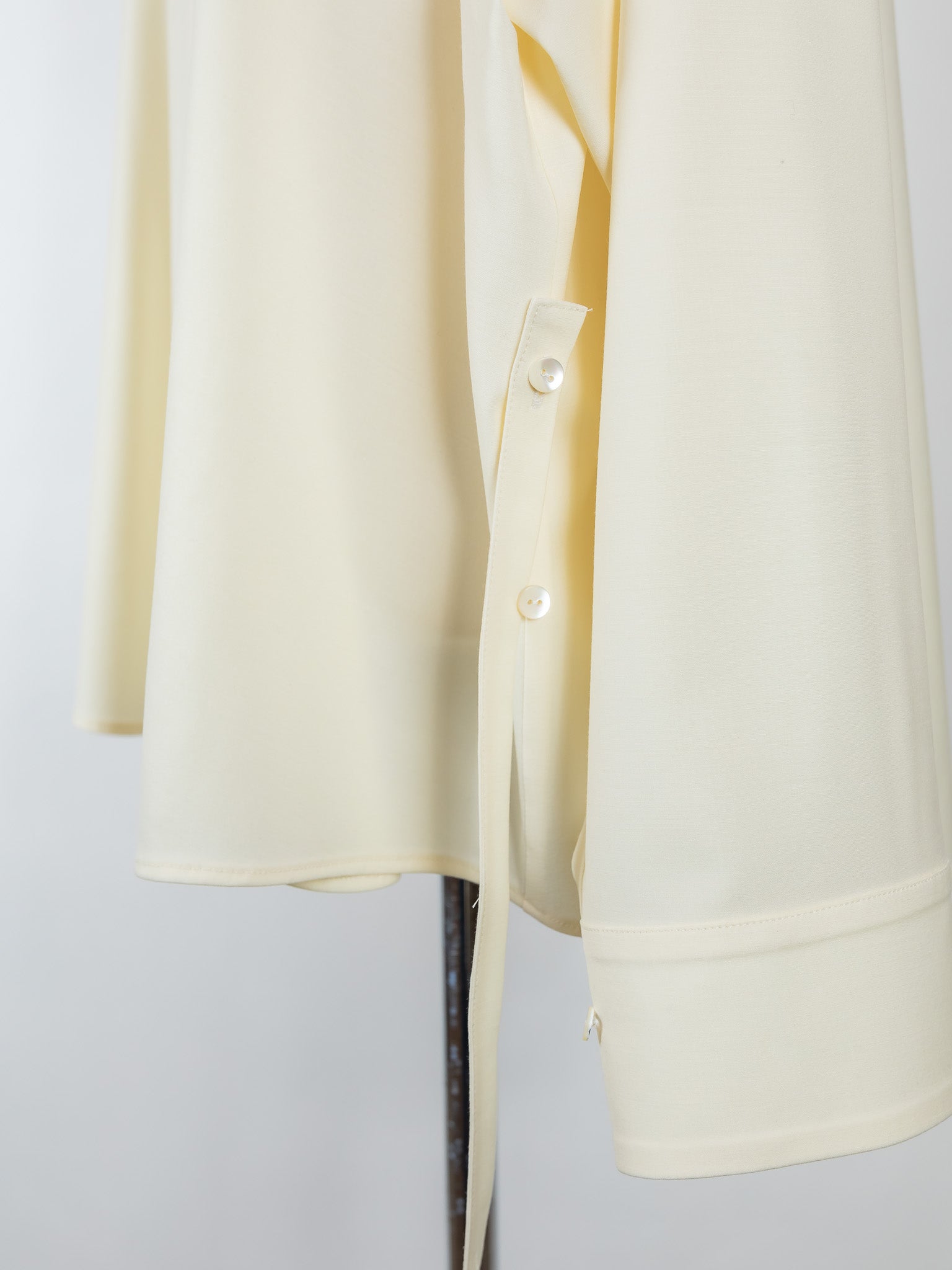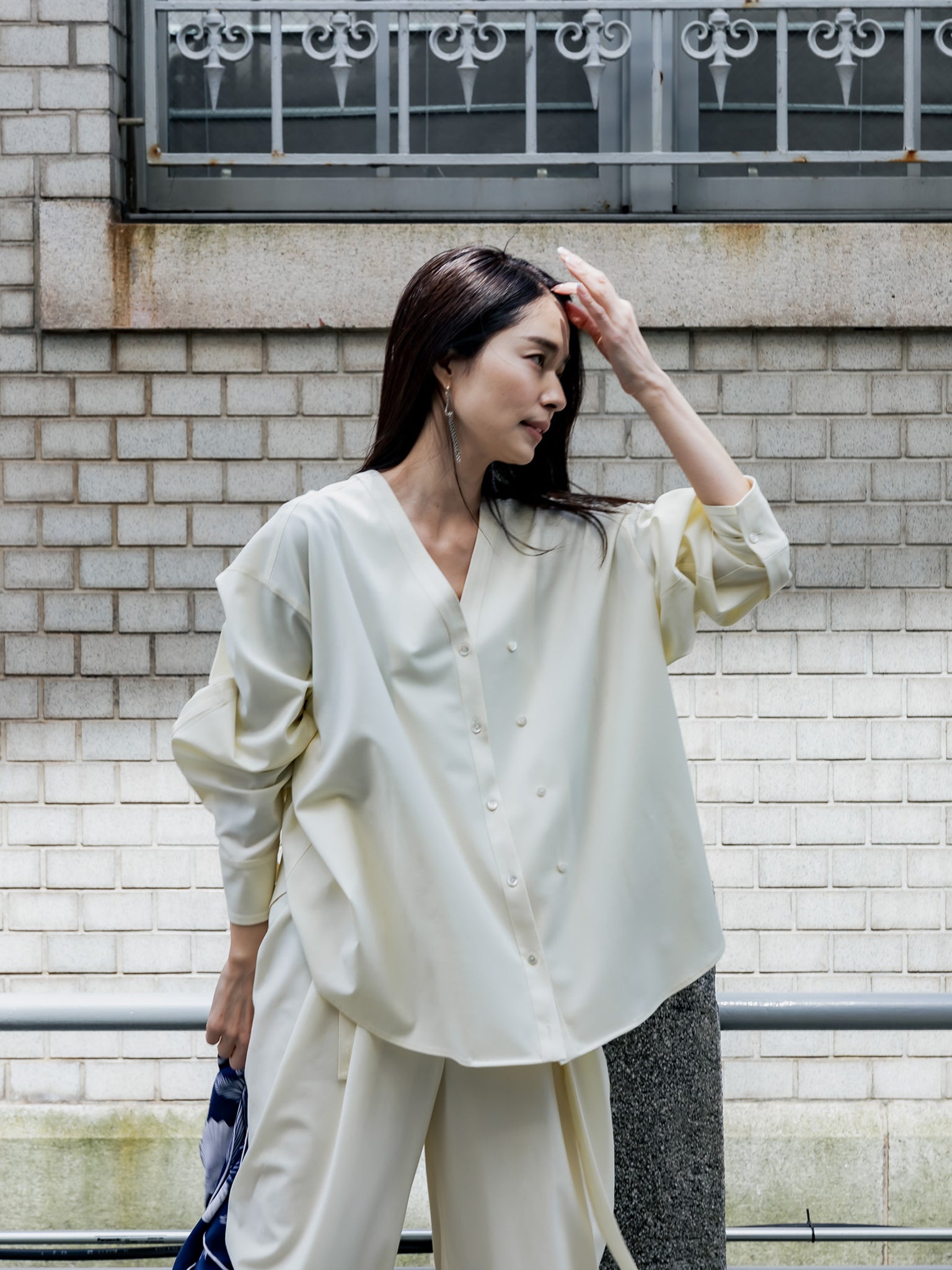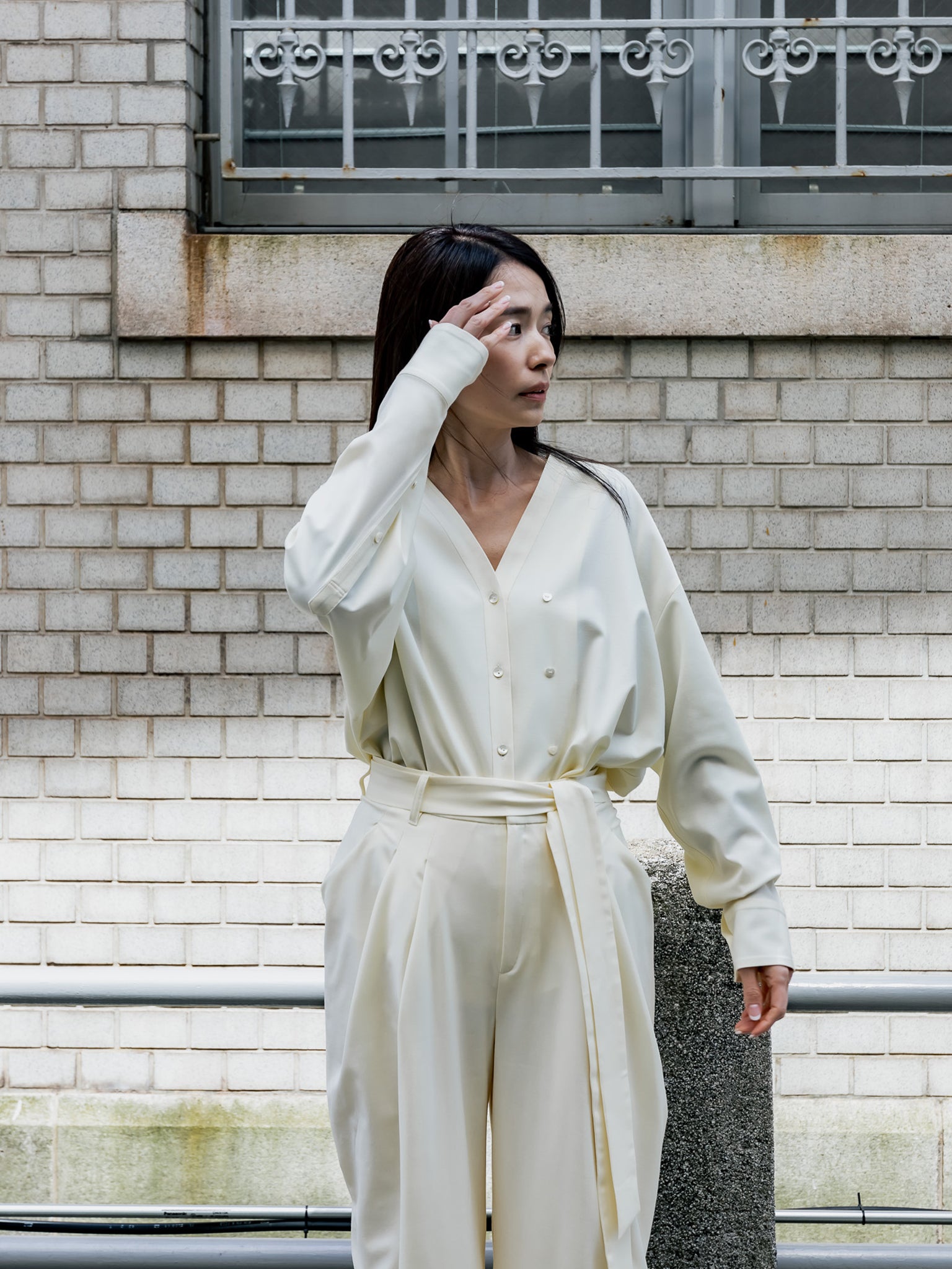 This shirt jacket is made from the same high-quality fabric as the drape pants. Its relaxed silhouette and supple material make it a flattering shirt for all body types. You can also change the look by adjusting the button positions and the attached strings, so you can throw it on over a T-shirt or tank top, or you can fasten the buttons to adjust the V-neck, turn it into a wrap, or use it as a stole, allowing you to enjoy a variety of different looks. It pairs beautifully with the drape pants, made from the same material, and also works well as a dress-up T-shirt with the first step pants or my muse skirt, or as a light jacket for chilly days or indoors when worn over a relax dress. Discover the hidden little heart of adult playfulness.