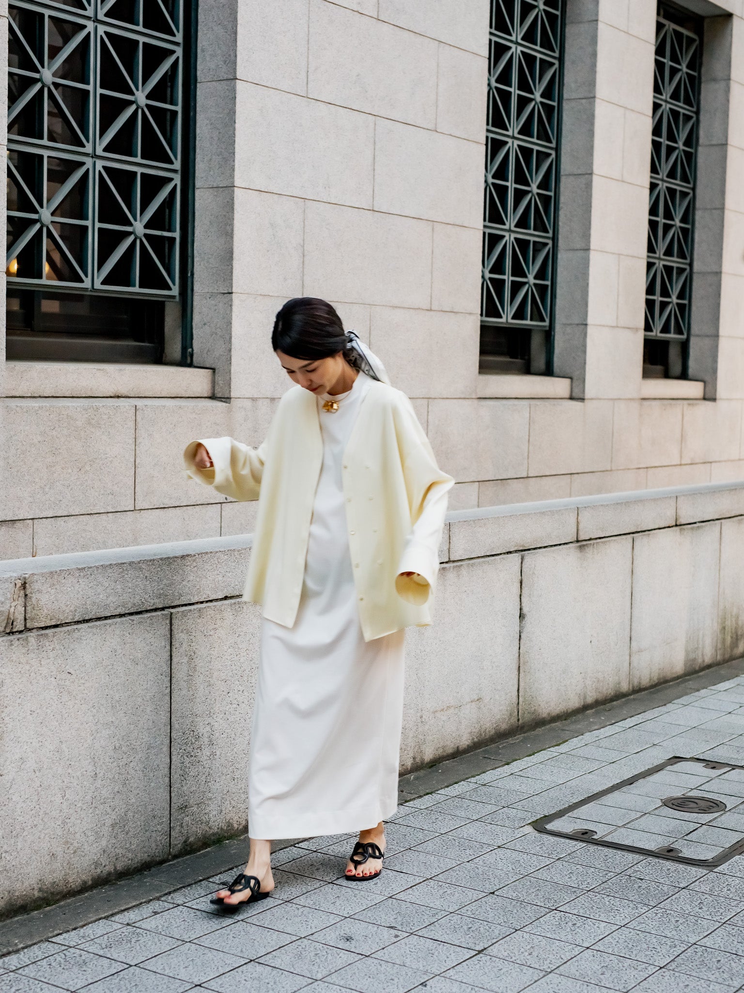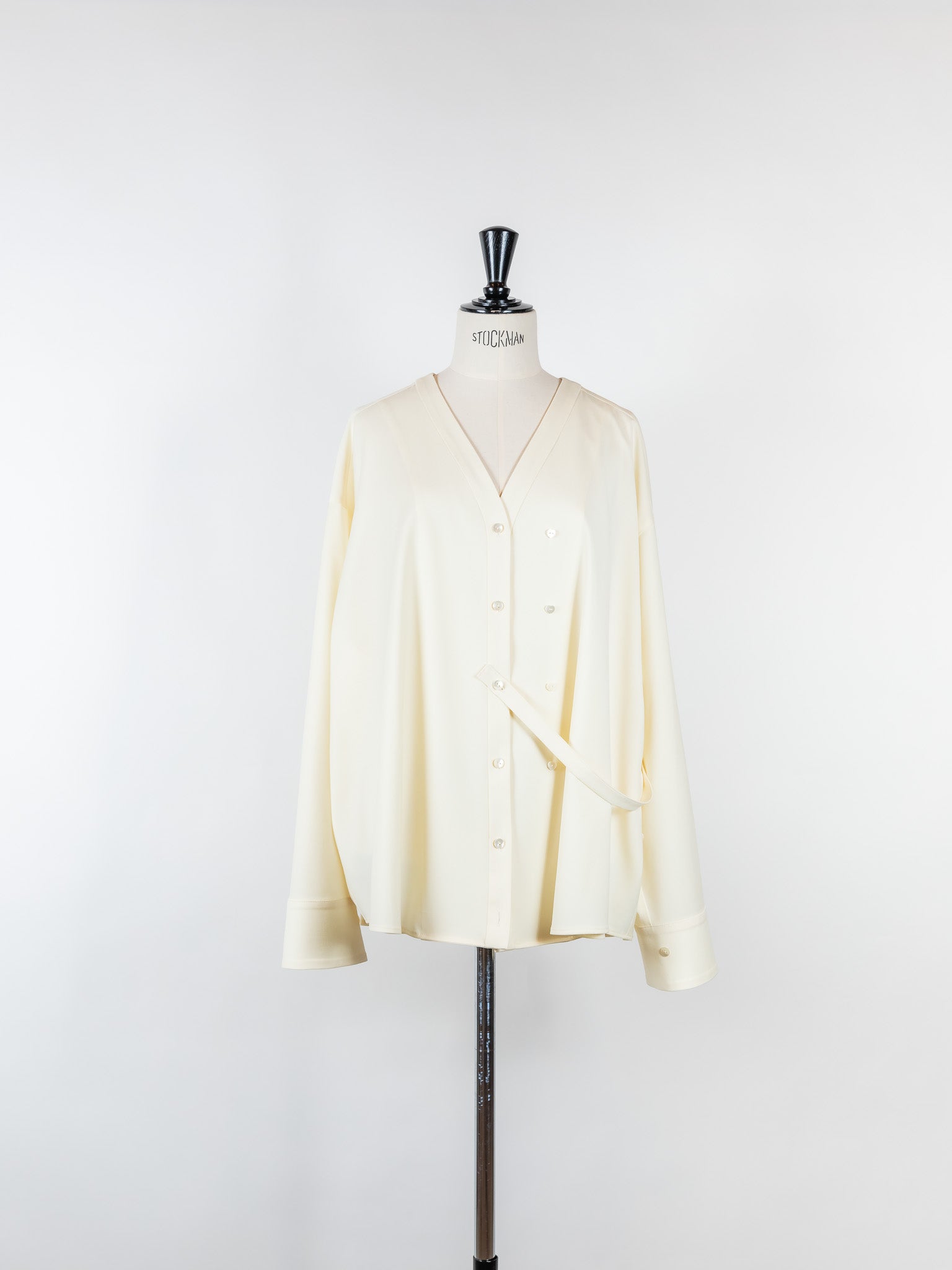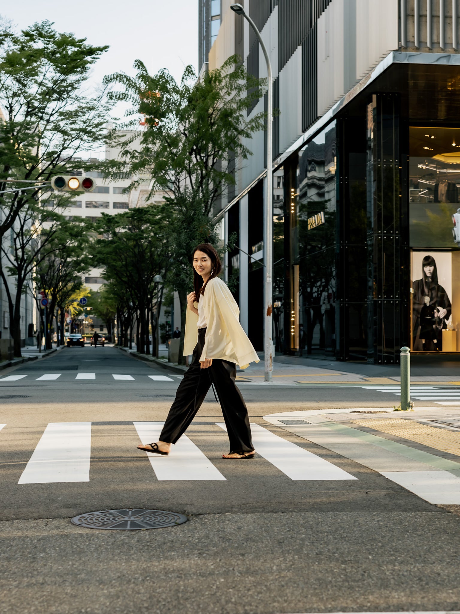 This shirt jacket is made from the same high-quality fabric as the drape pants. Its relaxed silhouette and supple material make it a flattering shirt for all body types. You can also change the look by adjusting the button positions and the attached strings, so you can throw it on over a T-shirt or tank top, or you can fasten the buttons to adjust the V-neck, turn it into a wrap, or use it as a stole, allowing you to enjoy a variety of different looks. It pairs beautifully with the drape pants, made from the same material, and also works well as a dress-up T-shirt with the first step pants or my muse skirt, or as a light jacket for chilly days or indoors when worn over a relax dress. Discover the hidden little heart of adult playfulness.