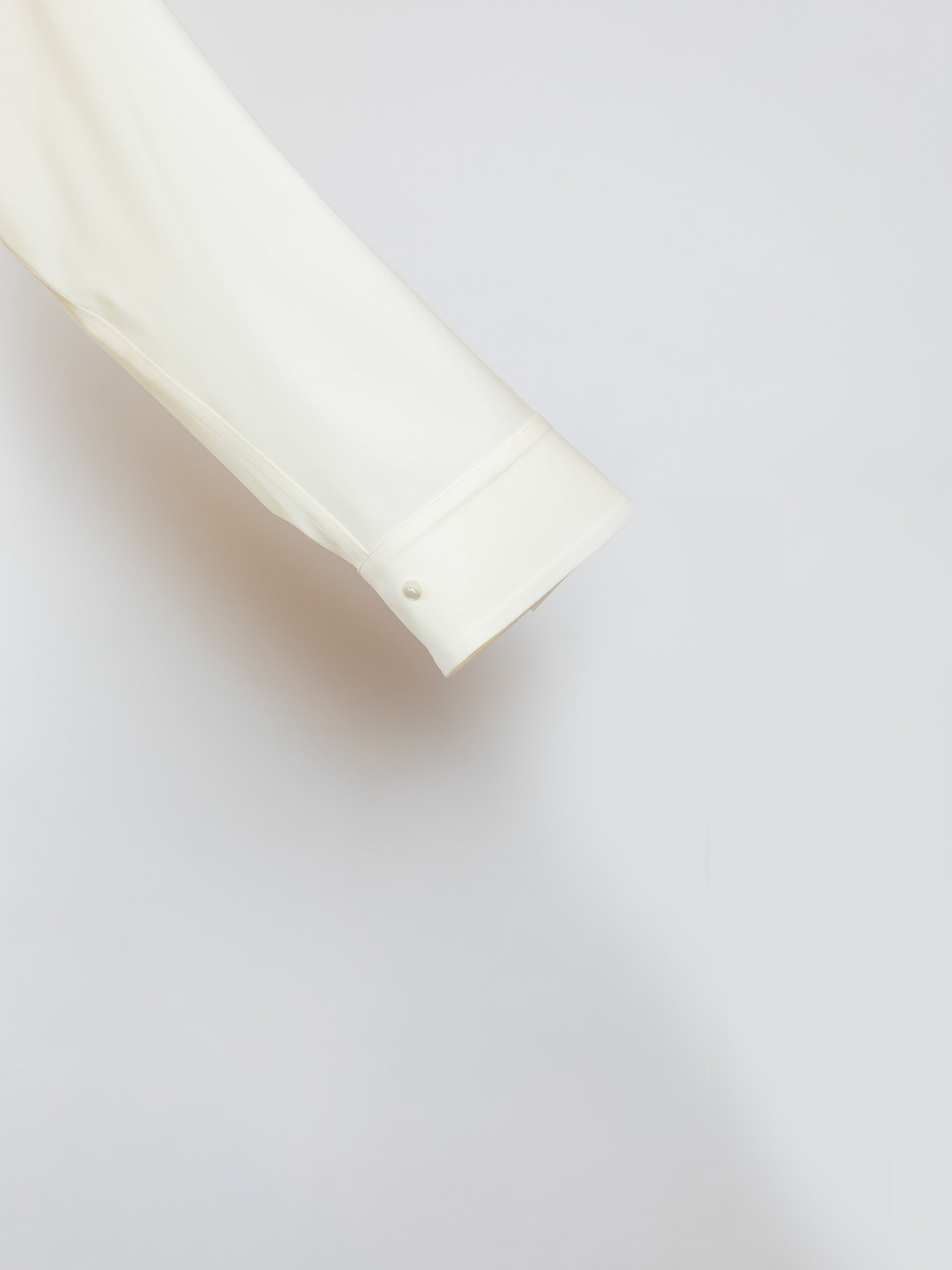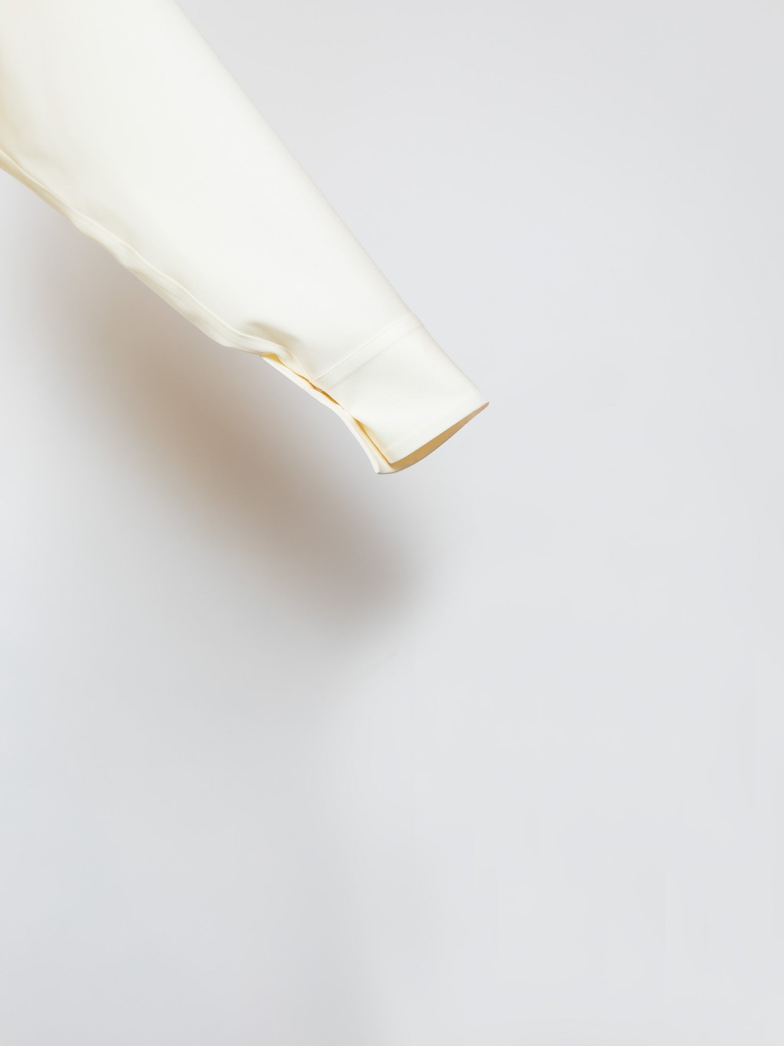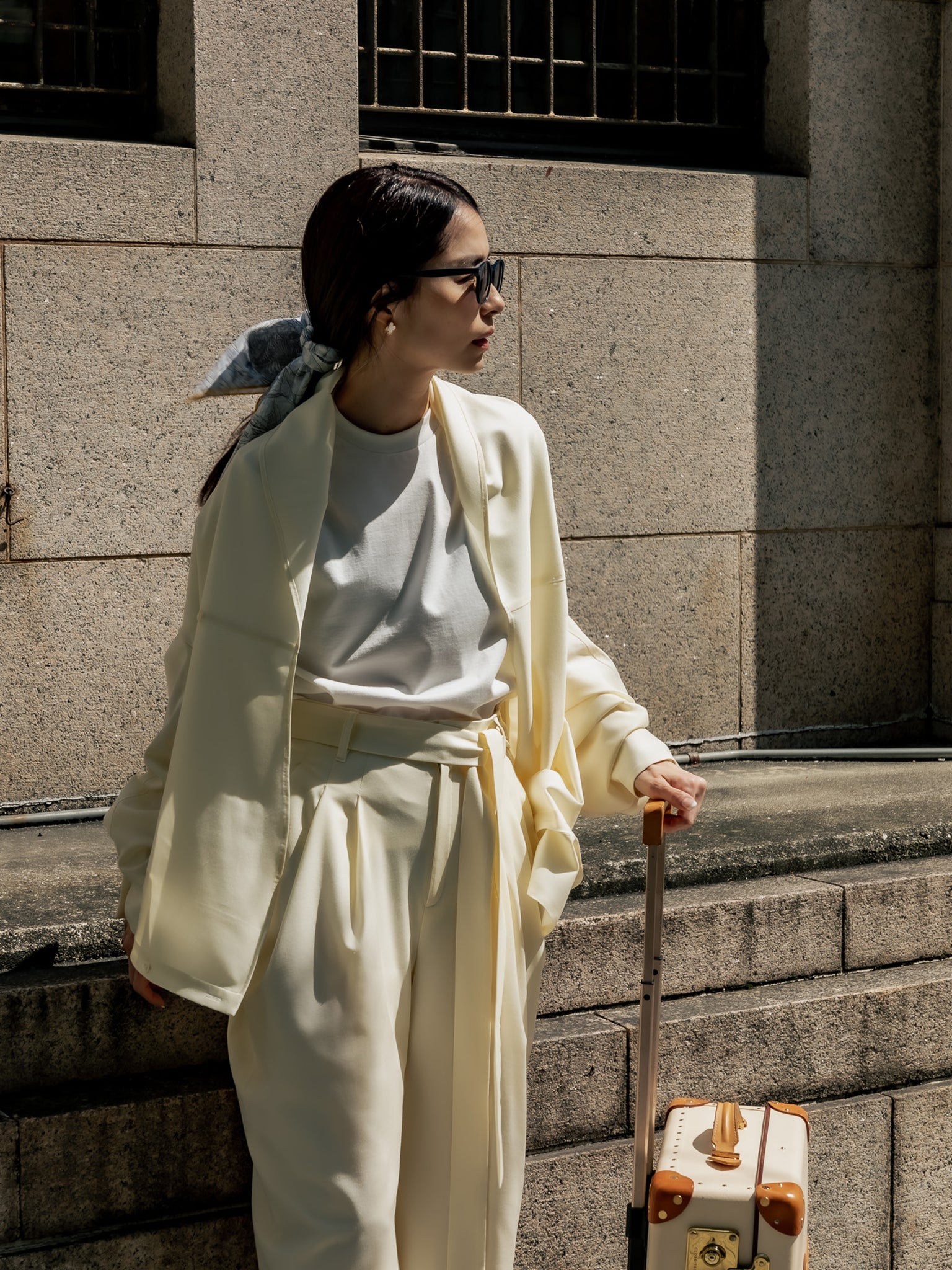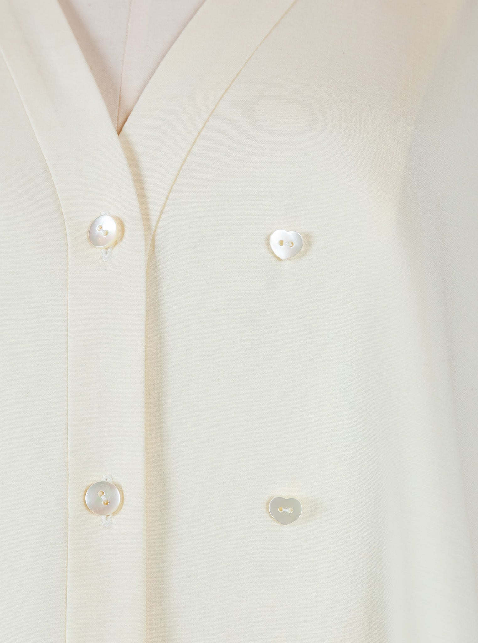This shirt jacket is made from the same high-quality fabric as the drape pants. Its relaxed silhouette and supple material make it a flattering shirt for all body types. You can also change the look by adjusting the button positions and the attached strings, so you can throw it on over a T-shirt or tank top, or you can fasten the buttons to adjust the V-neck, turn it into a wrap, or use it as a stole, allowing you to enjoy a variety of different looks. It pairs beautifully with the drape pants, made from the same material, and also works well as a dress-up T-shirt with the first step pants or my muse skirt, or as a light jacket for chilly days or indoors when worn over a relax dress. Discover the hidden little heart of adult playfulness.