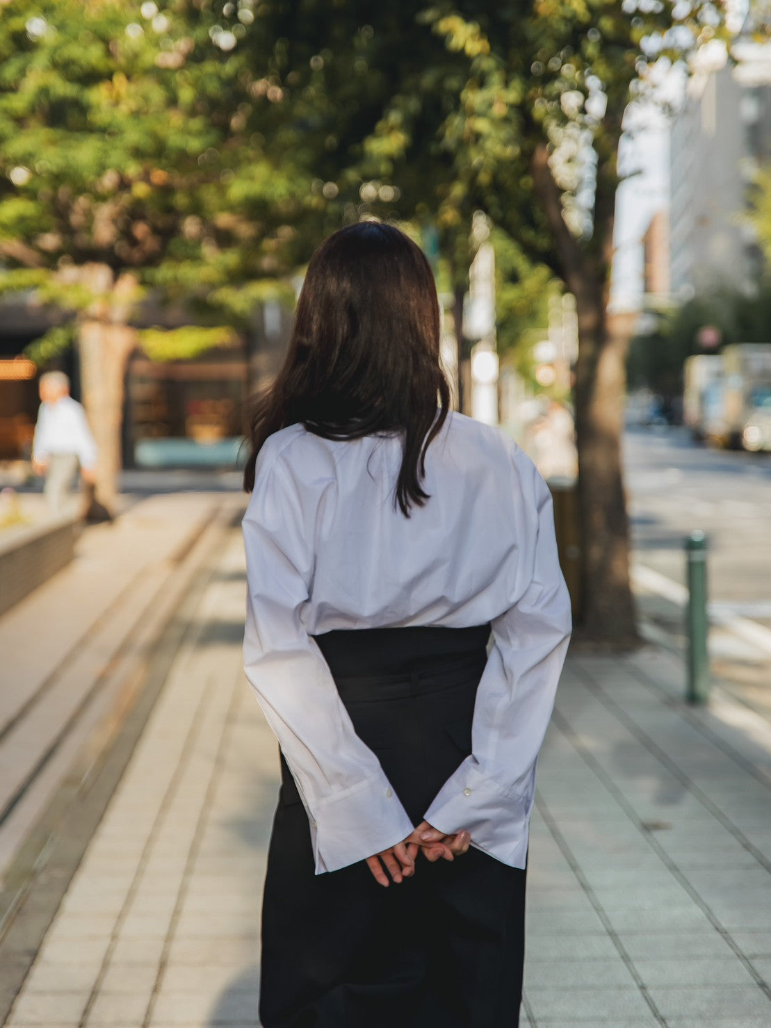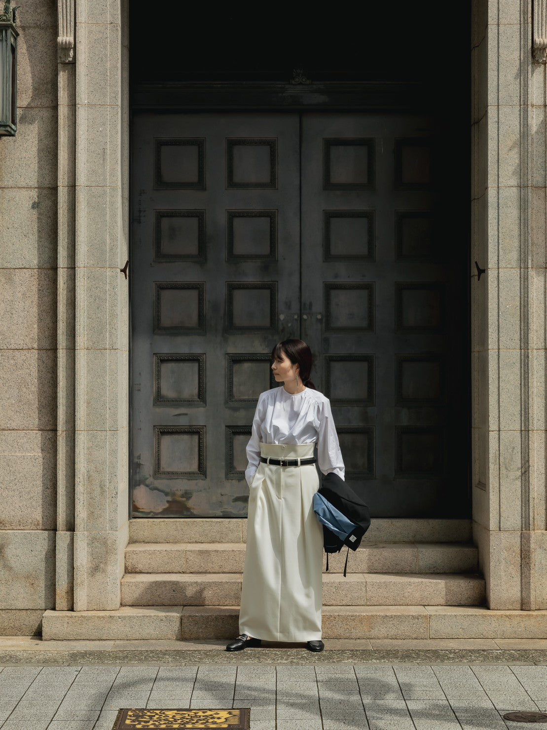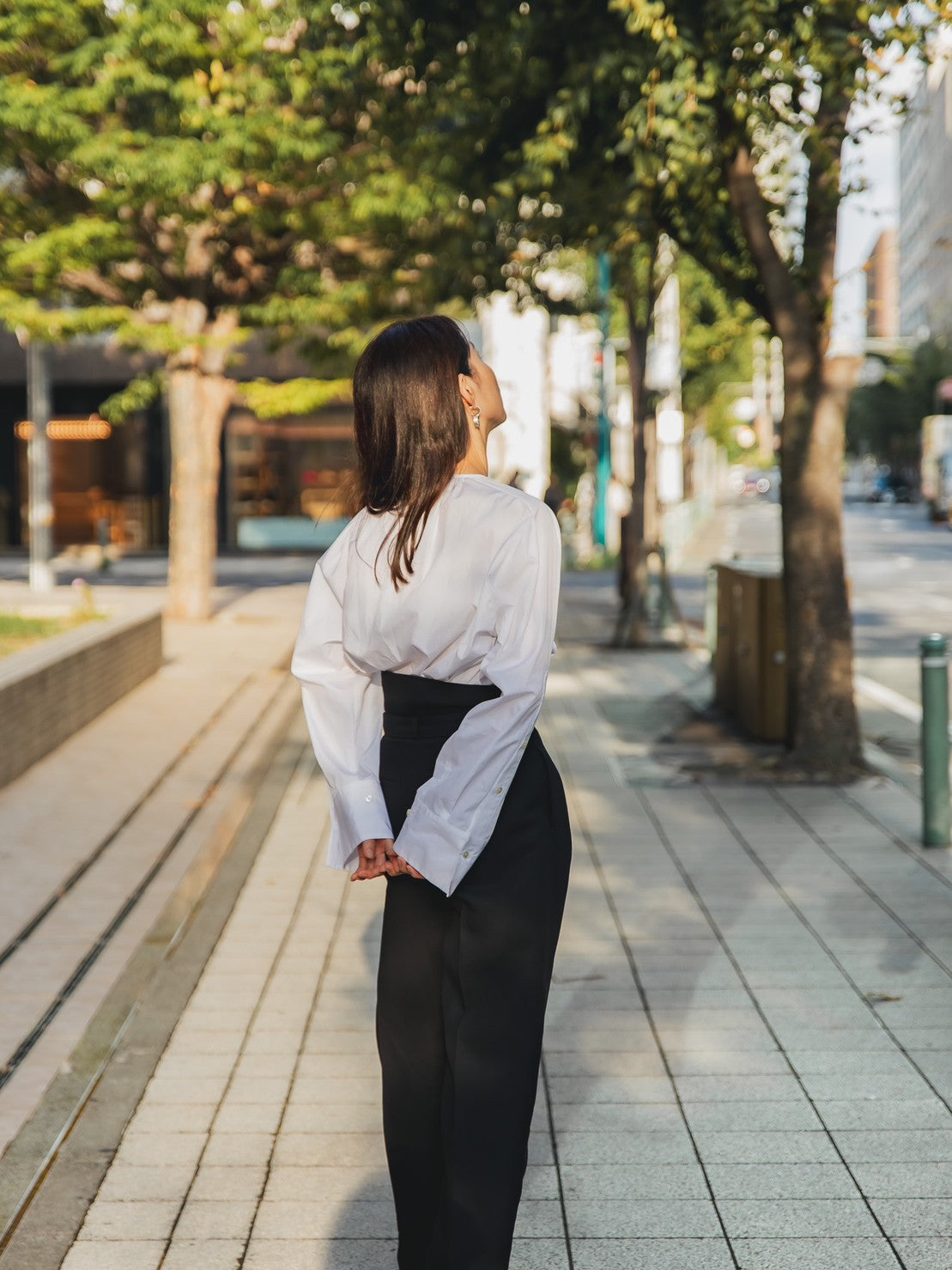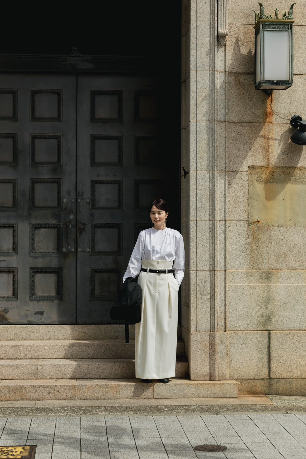 This cotton drape shirt is made from high-quality organic cotton by Thomas Maison. The beautiful luster of the natural material is enhanced by skillfully applied tucks and gathers, allowing the fabric to move beautifully just by wearing it.