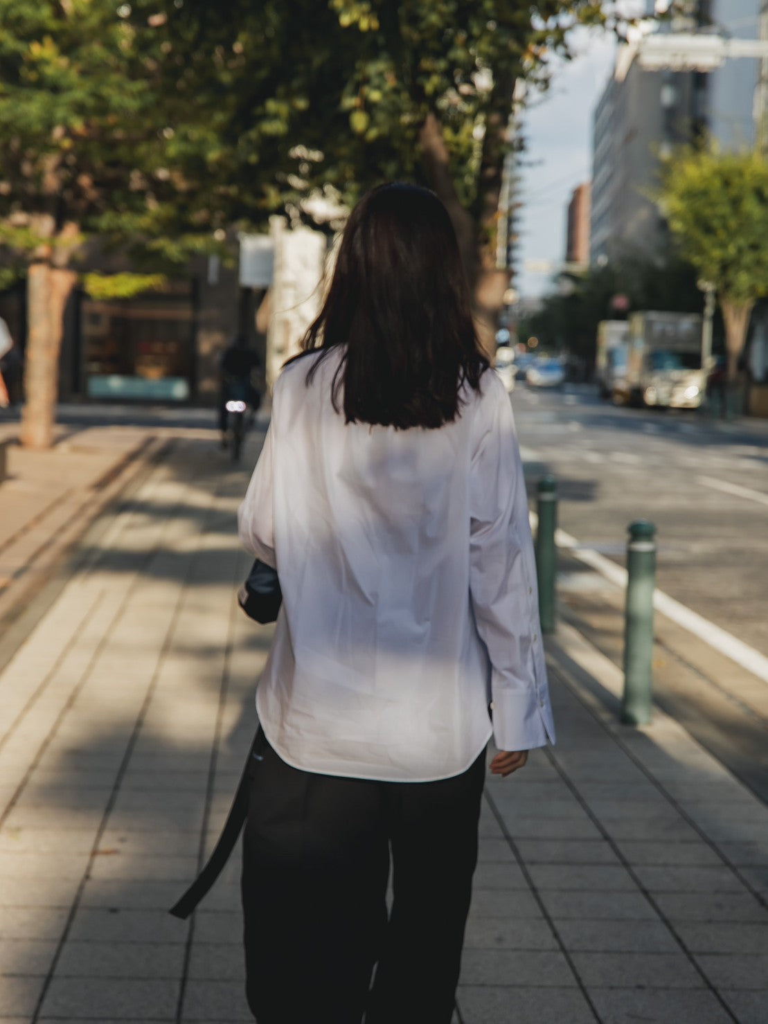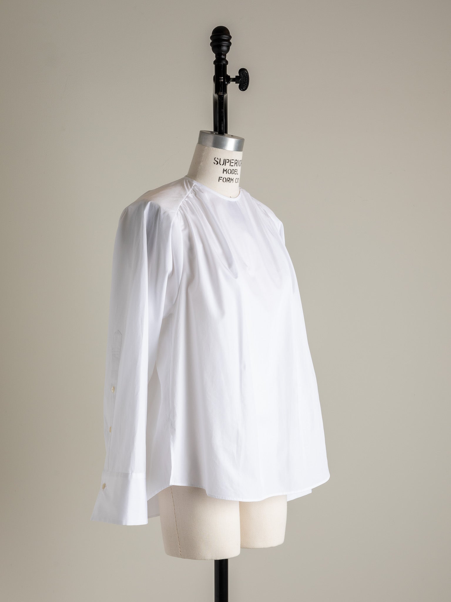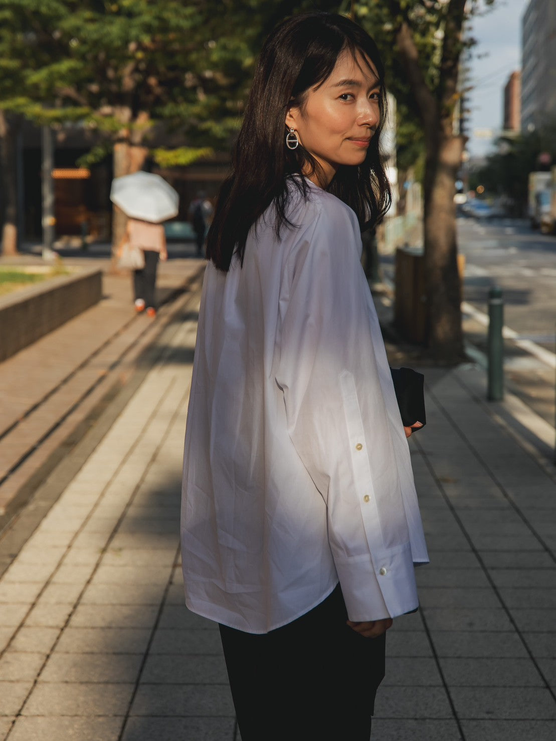This cotton drape shirt is made from high-quality organic cotton by Thomas Maison. The beautiful luster of the natural material is enhanced by skillfully applied tucks and gathers, allowing the fabric to move beautifully just by wearing it.