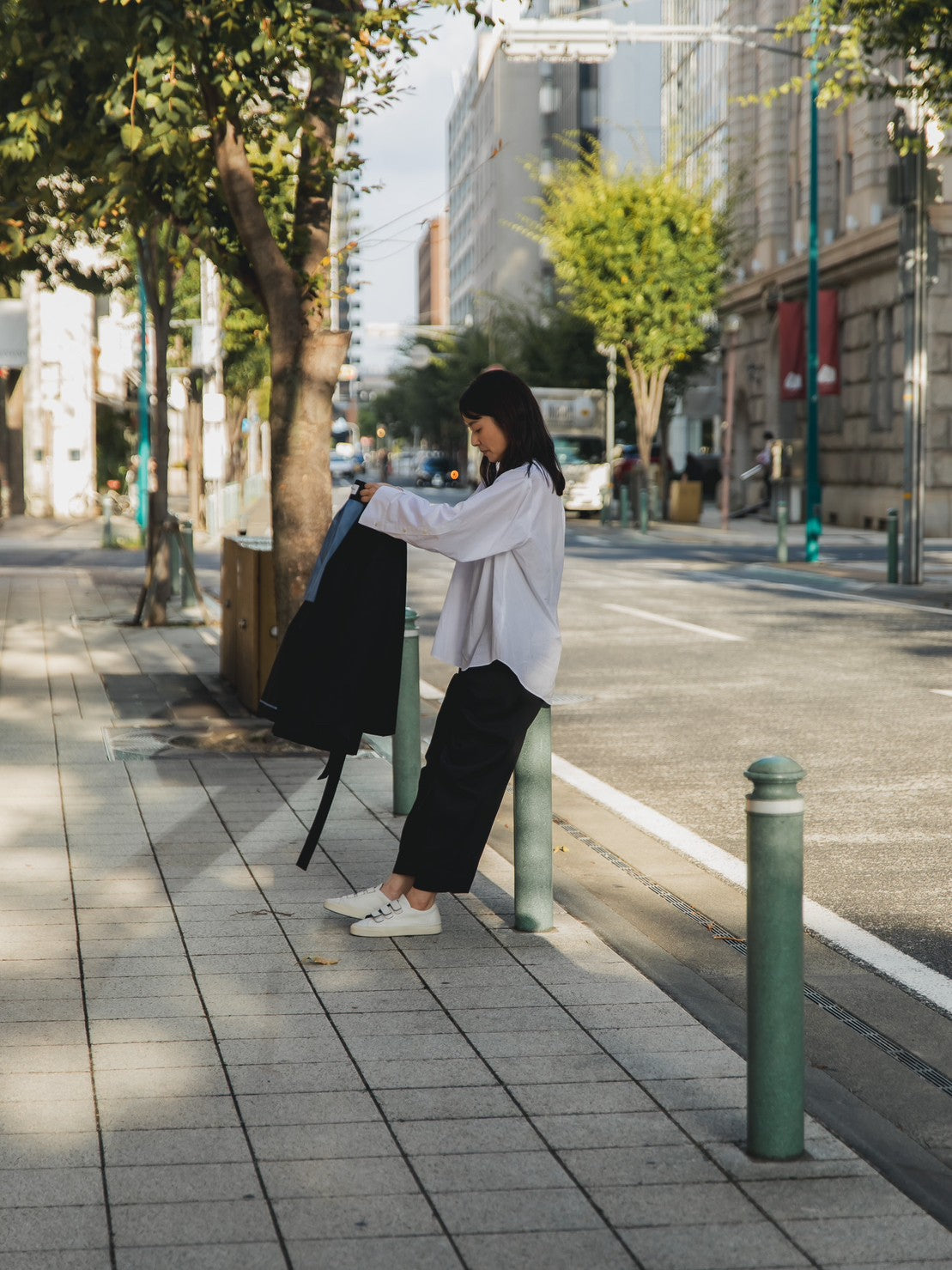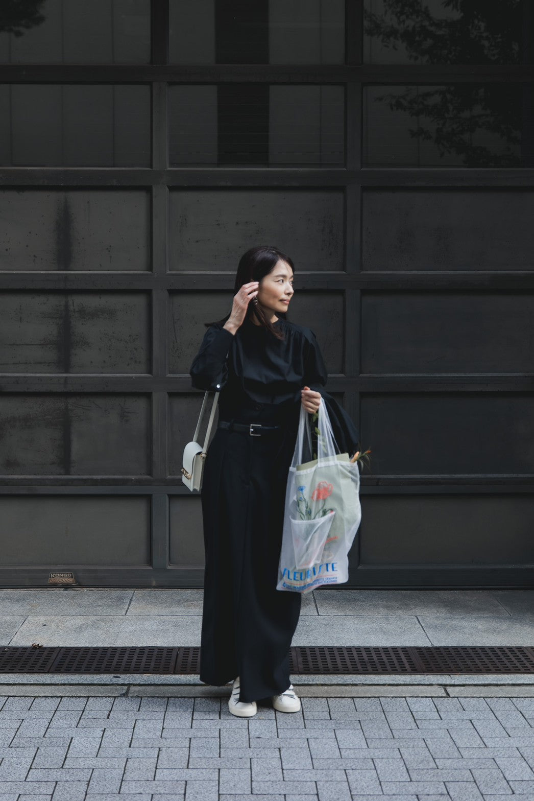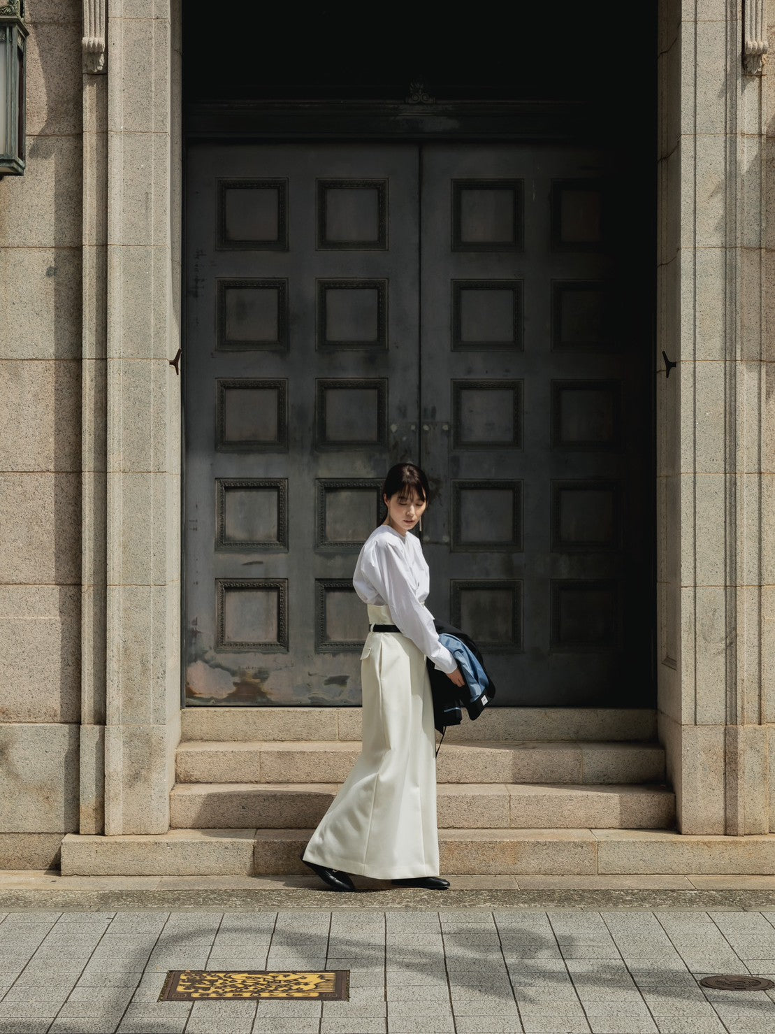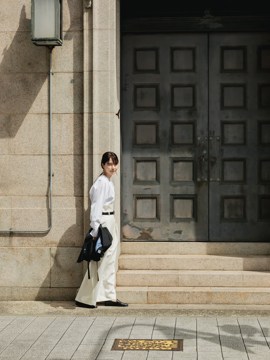 This cotton drape shirt is made from high-quality organic cotton by Thomas Maison. The beautiful luster of the natural material is enhanced by skillfully applied tucks and gathers, allowing the fabric to move beautifully just by wearing it.