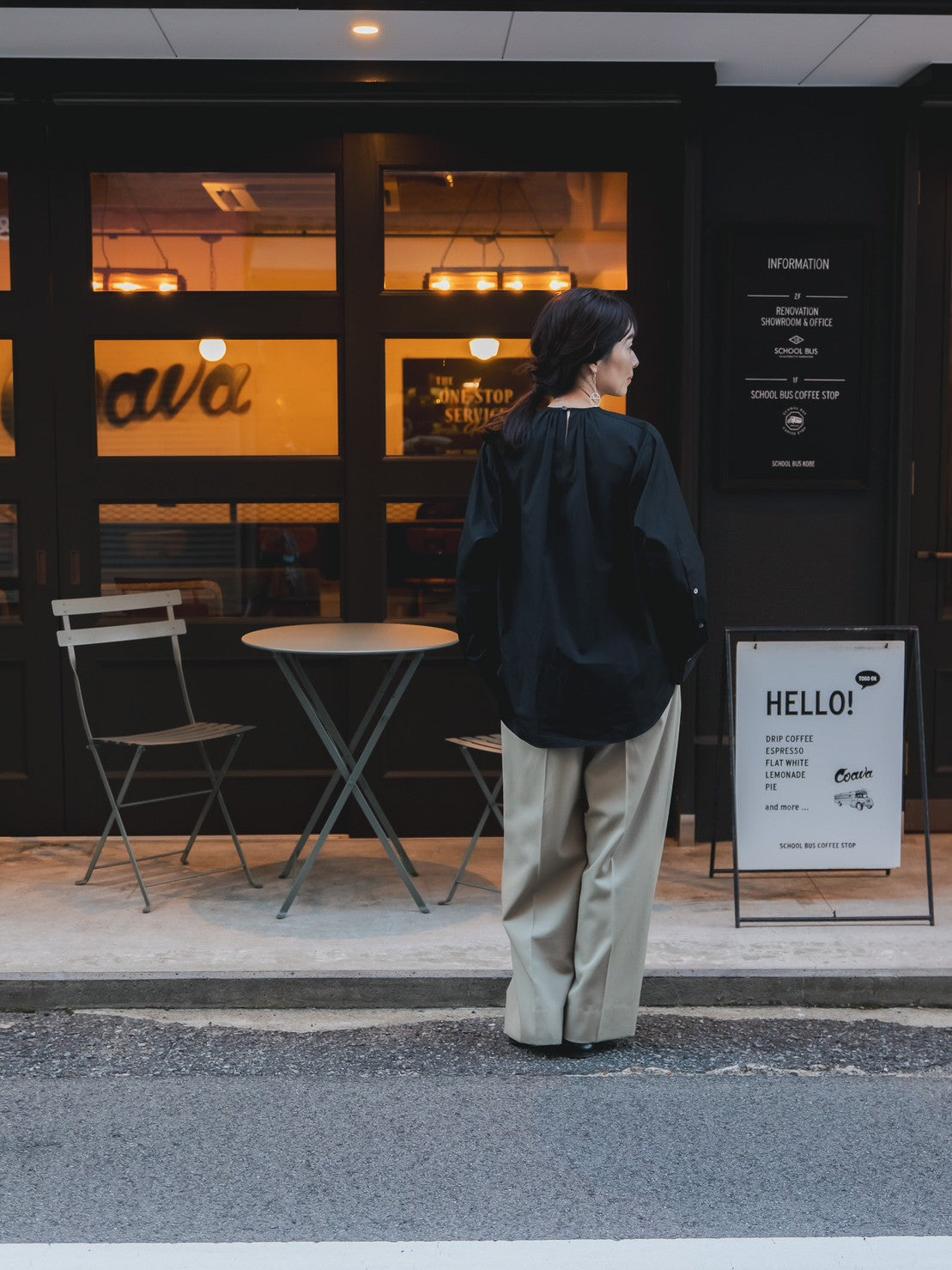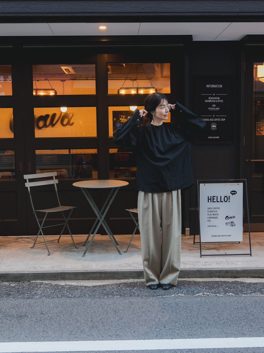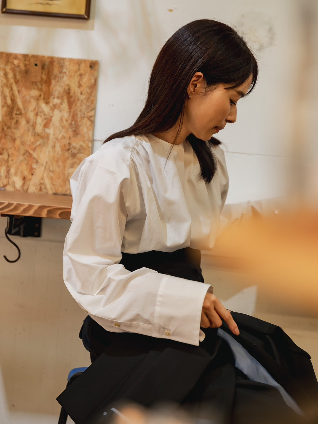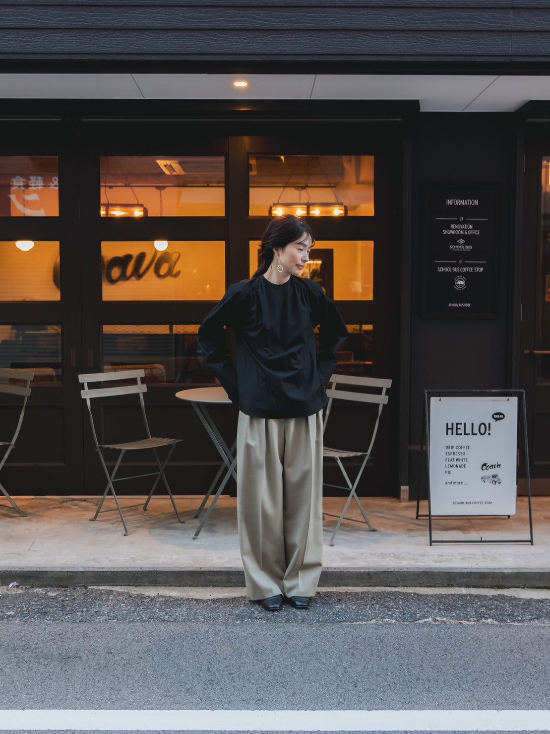 This blouse is made with careful attention to the placement and amount of tucks and gathers so that it drapes not only from the front but also from the sides and back, giving it a moderately modern impression without being too sweet, while also being cool and mature.