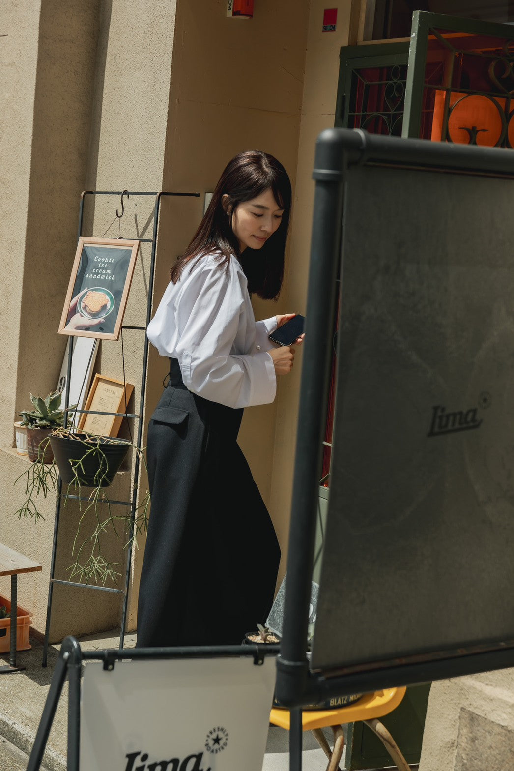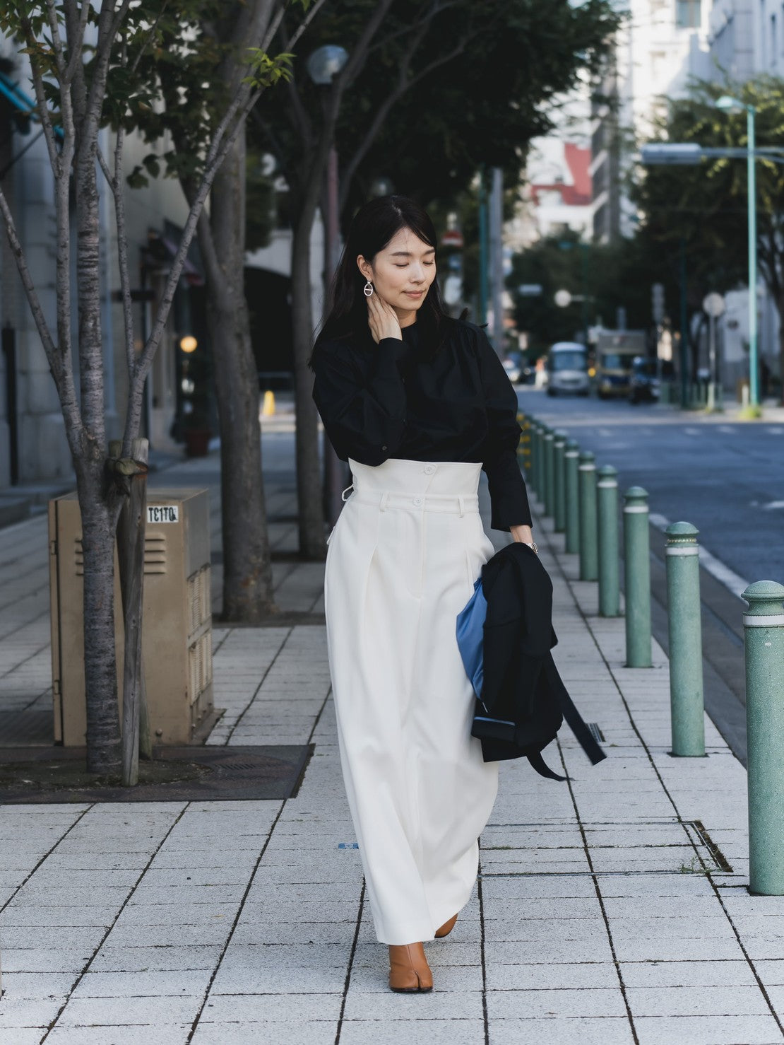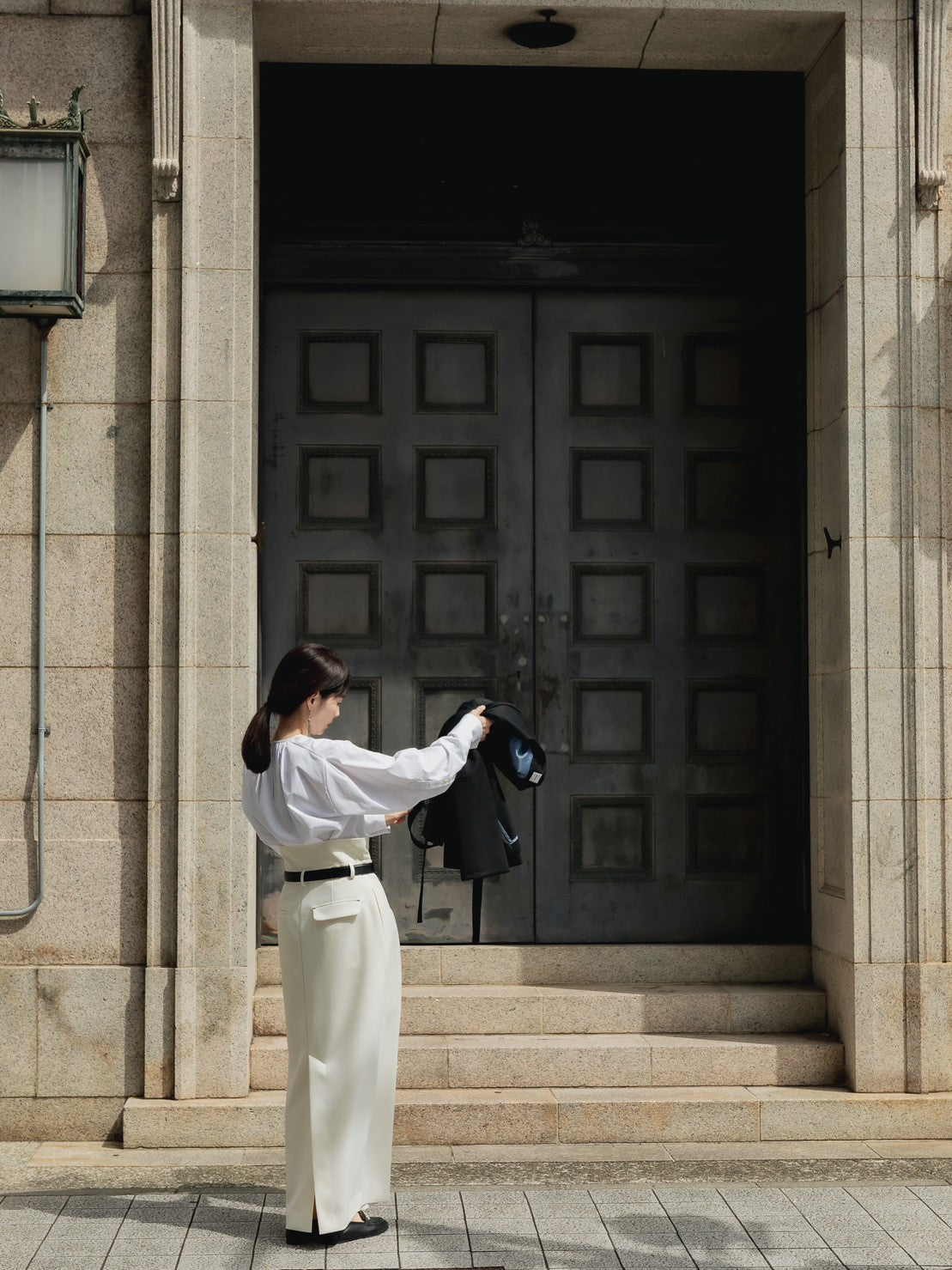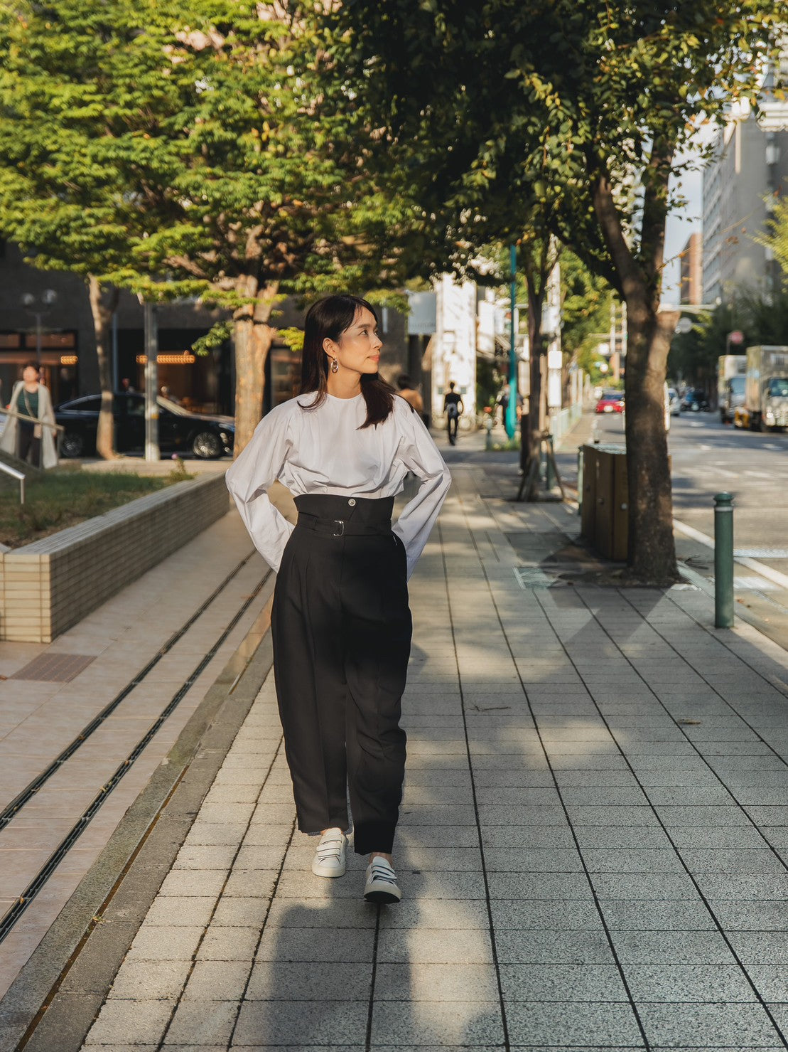 This blouse is made with careful attention to the placement and amount of tucks and gathers so that it drapes not only from the front but also from the sides and back, giving it a moderately modern impression without being too sweet, while also being cool and mature.
