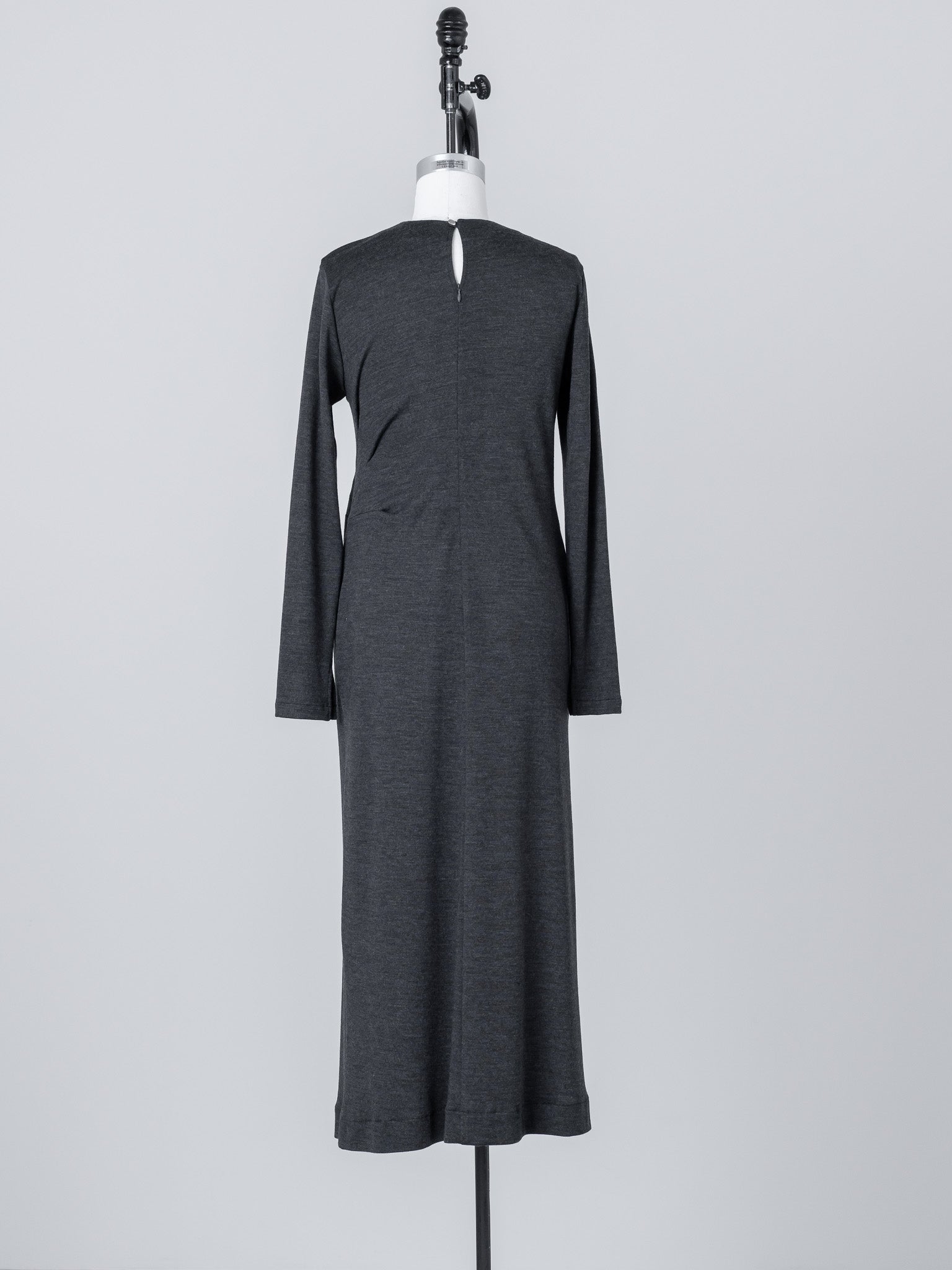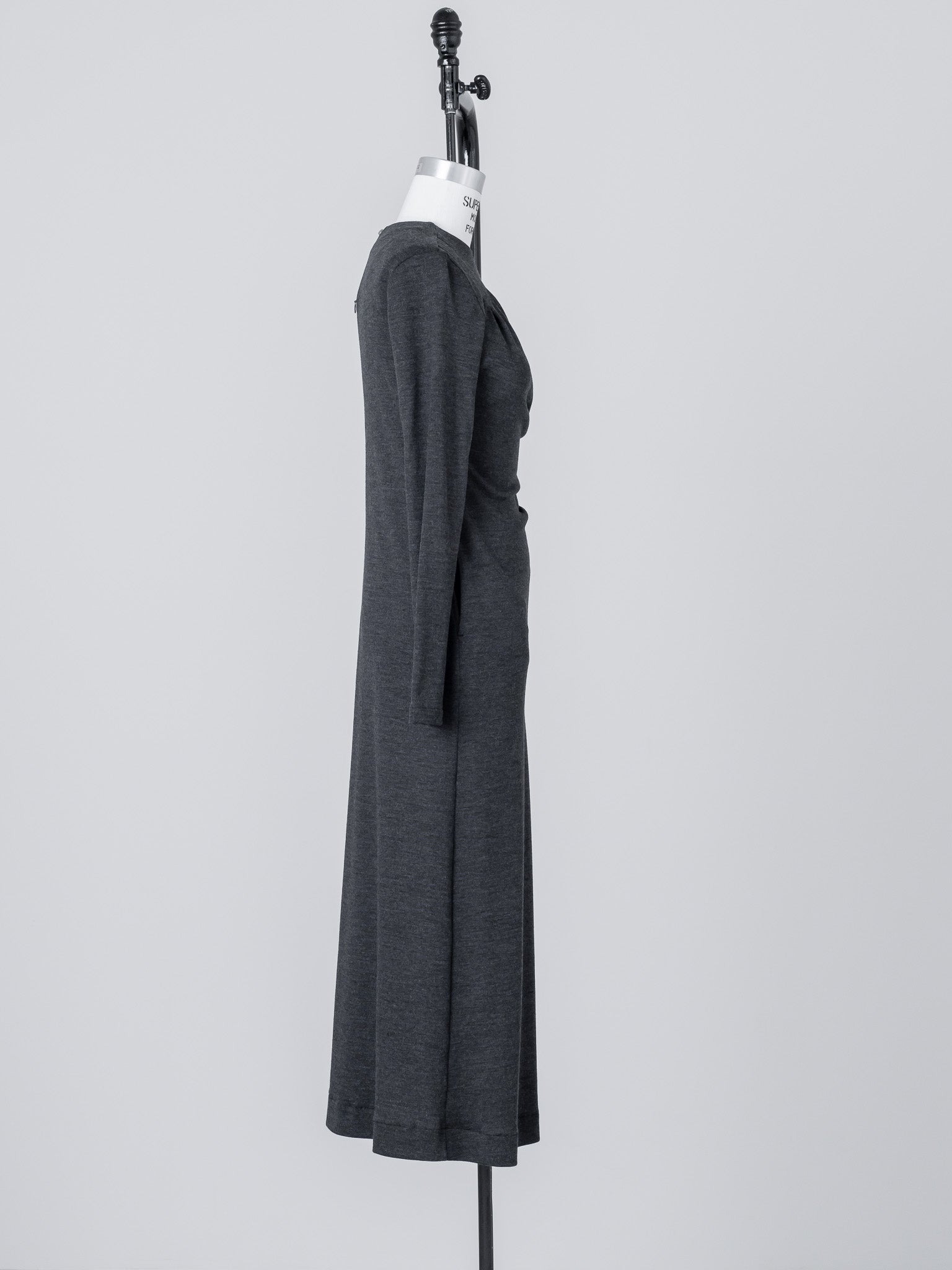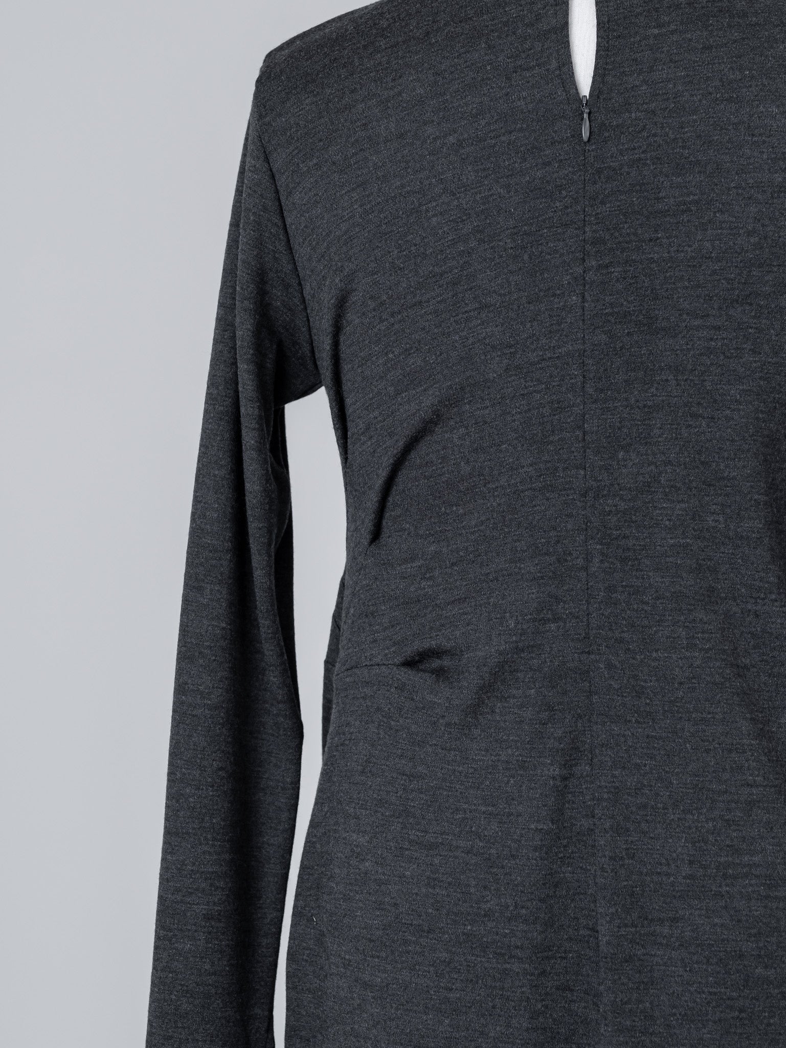 肩先から対角線の腰にかけてタックによるドレープを施すことで、長袖のジャージーワンピースにありがちな部屋着感を全く感じさせないデザインになっています
