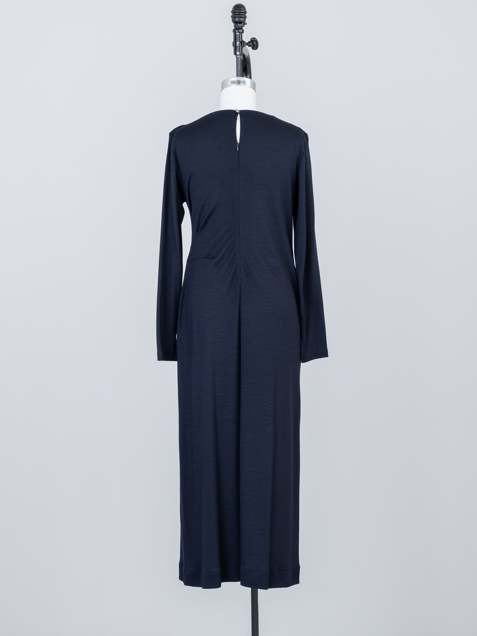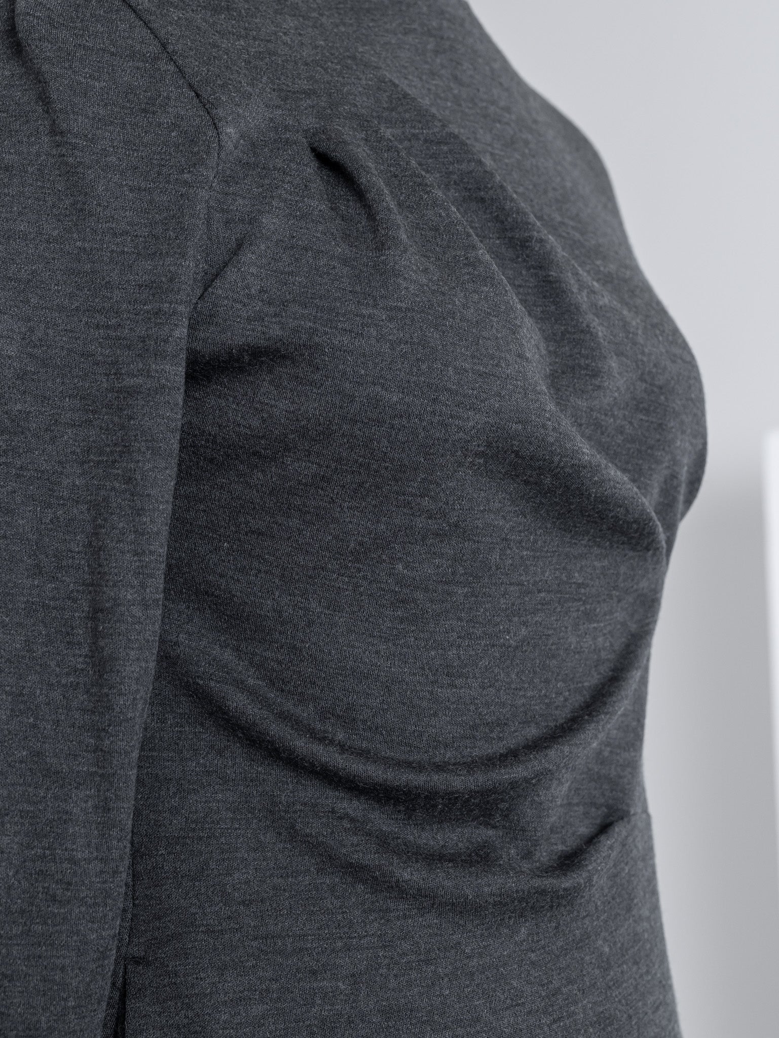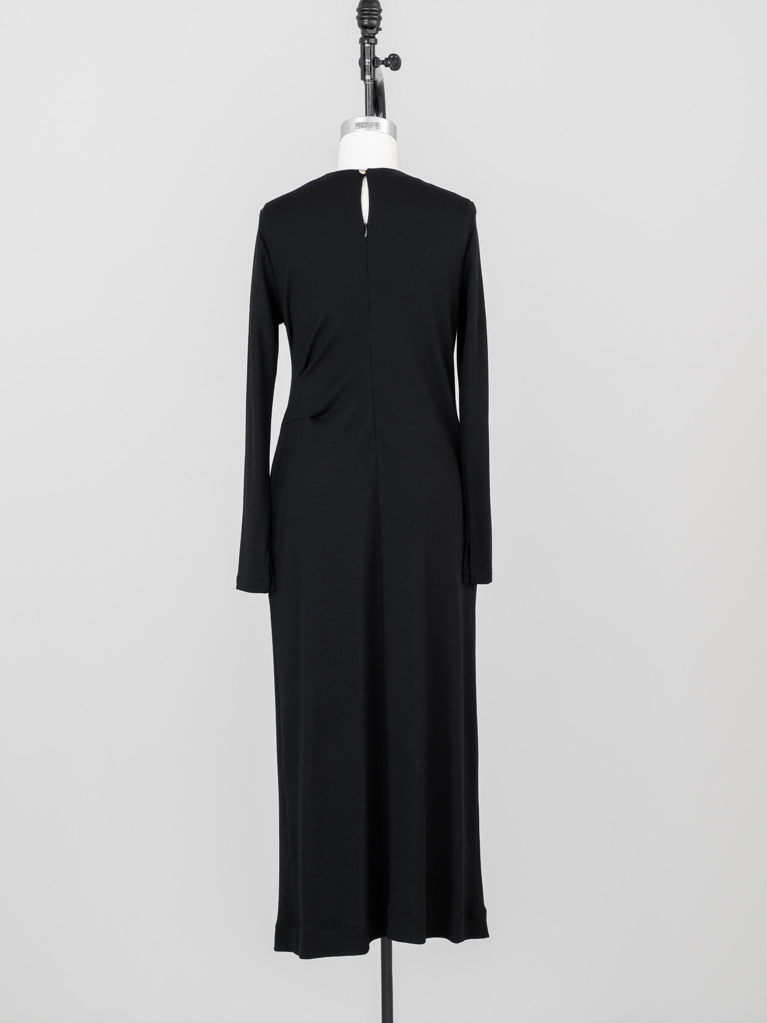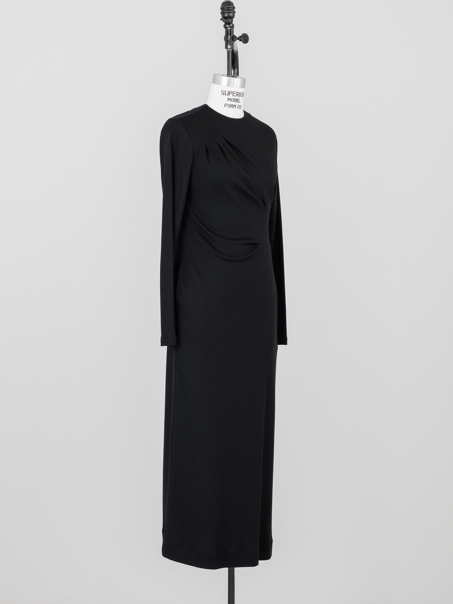 肩先から対角線の腰にかけてタックによるドレープを施すことで、長袖のジャージーワンピースにありがちな部屋着感を全く感じさせないデザインになっています