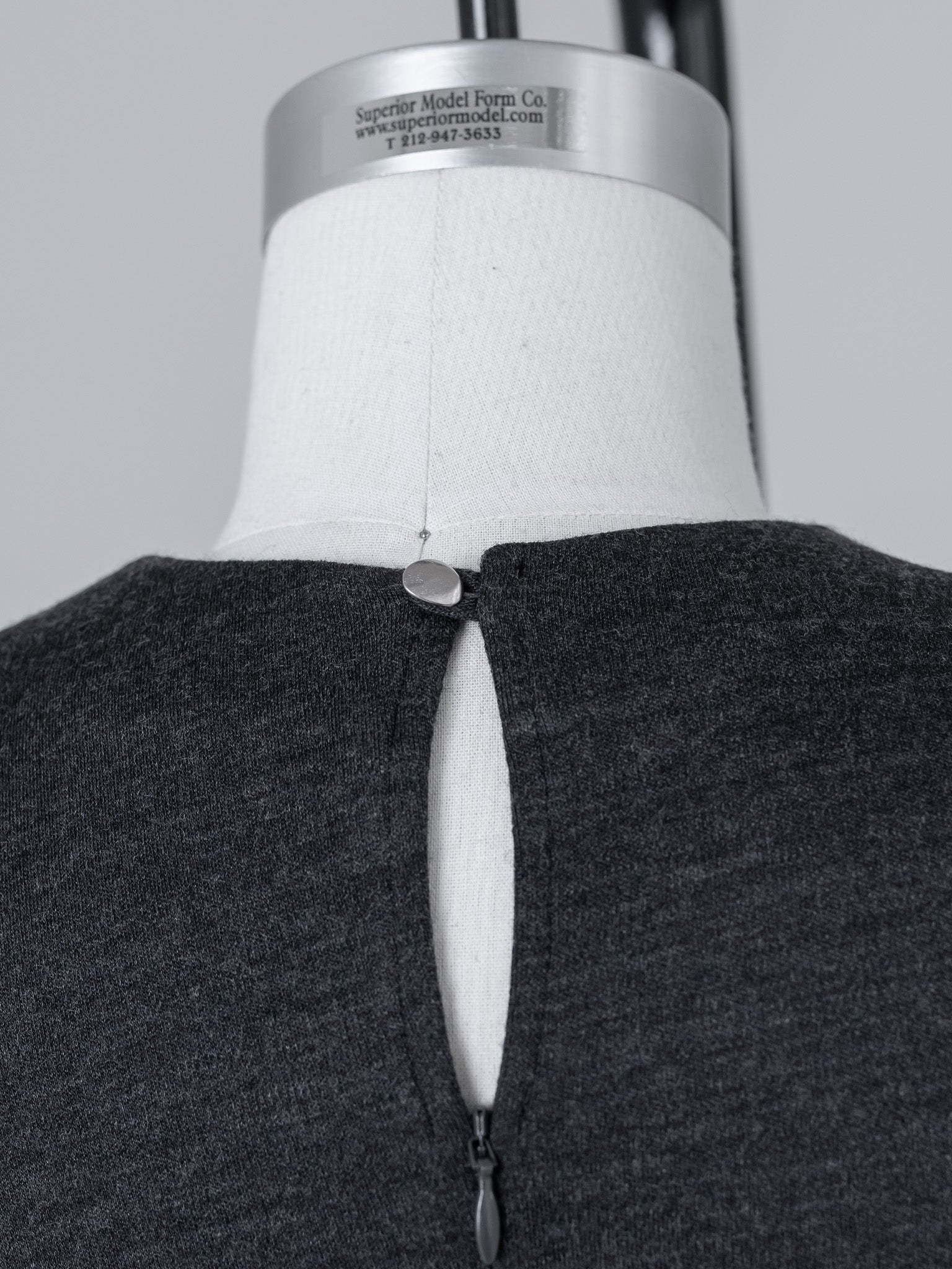 後ろファスナー開きで着脱もスムーズにでき、髪型や綺麗な装いを崩さずに着脱できる仕様になっています。ファスナー止まりの上にはスリットとボタンを配し、実用性だけでなく後ろ姿にさりげないアクセントを添え、美しい印象を演出します。